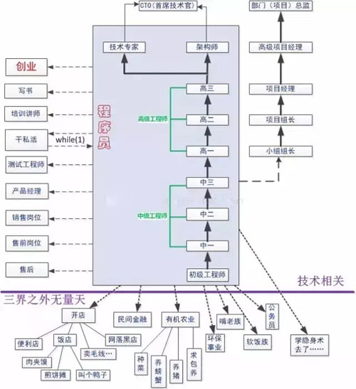 左边的一列讲述的是程序员自己创业,紫线下面是转从事其他行业。右侧一列是程序员正常晋升机制:当你晋升到中三级时,将面临一个重要的选择。